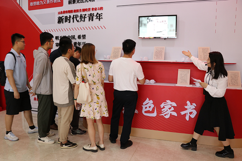 “紅色家書”互動墻前,一封封“紅色家書”通過數(shù)字智能互動技術播放,團員青年們駐足閱讀,認真聆聽,追憶革命先輩家國情懷,體悟感受信仰力量。